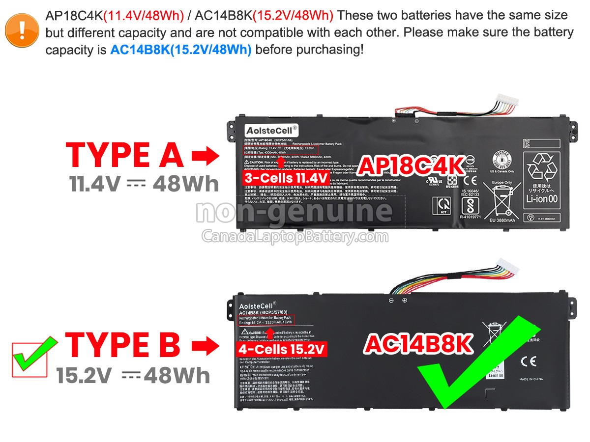 The new Acer SWIFT 3 (N17W7) battery is made with Grade A battery cells and 100% compatible with the original battery specifications. Before placing an order, please ensure your old battery is 15.2V 48Wh(4 cell), not a 11.25V, 3 cell battery.