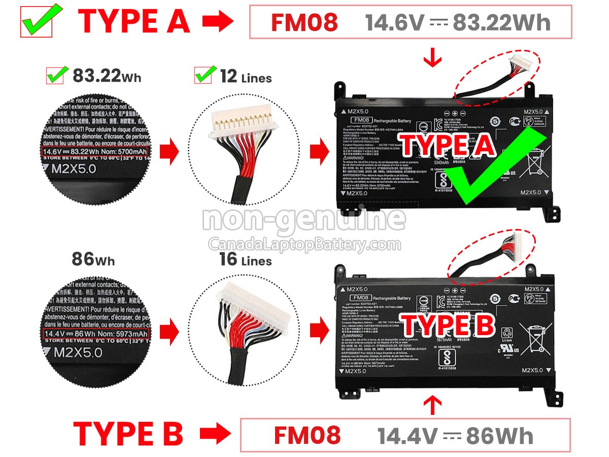 Note :1. 14.4V and 14.6V are compatible, they are in common use. 2. Before placing an order please check your old battery's connector at first, ensure the connector's lines is same to our battery. 3.If your old battery part number is 922977-855 and the capacity of the battery is 86Wh and AC Adapter is 230W, please order the 16-lines battery. 4.If your old battery part number is 922976-855 and the capacity of the battery is 82Wh/83.22Wh and AC Adapter is 135W/150W, please order the 12-lines battery.